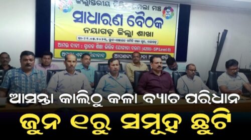 ନୟାଗଡ଼,(ନୟାଗଡ଼ ଦର୍ପଣ): ଆଜି ନୟାଗଡ଼ ପଞ୍ଚାୟତ ସମିତି ସଭାଗୃହରେ ନୟାଗଡ଼ ଜିଲ୍ଲା ମିଳିତ ଅମଲା ମଞ୍ଚ ପକ୍ଷରୁ ଏକ ସଭାର ଆୟୋଜନ କରାଯାଇଥିଲା । ନୟାଗଡ଼ ଜିଲ୍ଲା ମିଳିତ ମଞ୍ଚ ଅଧ୍ୟକ୍ଷ କୈଳାସ ଚନ୍ଦ୍ର ଓଝାଙ୍କ ସଭାପତିତ୍ବରେ ଅନୁଷ୍ଠିତ ଉକ୍ତ କାର୍ଯ୍ୟକ୍ରମରେ ସଂଘର ମୁଖ୍ୟ ଉପଦେଷ୍ଟା ରଶ୍ମୀରଞ୍ଜନ ଦାସ, କାର୍ଯ୍ୟକାରୀ ସଭାପତି ବାଳକୃଷ୍ଣ ଦାସ, ସମ୍ପାଦକ ପ୍ରଦୀପ୍ତ କୁମାର ନନ୍ଦ ଓ ଆବାହକ ଶ୍ରୀଧର କୁମାର ସାହୁ ପ୍ରମୁଖ ଉପସ୍ଥିତ ରହିଥିଲେ । ଜିଲ୍ଲା ସ୍ତରୀୟ ମିଳିତ ଅମଲା ମଞ୍ଚ ପକ୍ଷରୁ ଏହି ଡାକରା ଦିଆଯାଇଥିଲା । ରାଜ୍ୟ ସରକାର ସେମାନଙ୍କ ଦାବି ପୁରଣ ନକଲେ ଆସନ୍ତା କାଲିଠାରୁ କଳା ବ୍ୟାଚ ପିନ୍ଧି ପ୍ରତିବାଦ କରିବେ । ଏଥି ସହିତ ଆସନ୍ତା ୧ତାରିଖରୁ ଜିଲ୍ଲାର ସମସ୍ତ ଅମଲା ସଂଘର କର୍ମକର୍ତା ମାନେ ସମୁହ ଛୁଟି ନେବେ ବୋଲି…