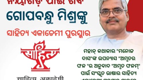 ନୟାଗଡ଼,(ନୟାଗଡ଼ ଦର୍ପଣ): ବର୍ତ୍ତମାନ ବନାରସ୍ ହିନ୍ଦୁ ୟୁନିଭରସିଟିରେ ସଂସ୍କୃତ ବିଭାଗର ପ୍ରଫେସର ଥିବା ଖ୍ୟାତନାମା ସାହିତ୍ୟିକ, ଗବେଷକ ପ୍ରଫେସର ଗୋପବନ୍ଧୁ ମିଶ୍ର ପାଇବେ ସାହିତ୍ୟ ଏକାଡେମୀ ପୁରସ୍କାର। ମହାନ୍ କଥାକାର “ମନୋଜ ଦାସ” ଙ୍କ ଉପନ୍ୟାସ “ଅମୃତର ଫଳ”ର ଅନୁବାଦ ” ଅମୃତ ଫଳମ୍” ପାଇଁ ସଂସ୍କୃତ ଭାଷାର ସାହିତ୍ୟ ଏକାଡେମୀ ପୁରସ୍କାର ପାଇବେ। ପ୍ରଫେସର ମିଶ୍ର ଙ୍କ ଜନ୍ମସ୍ଥାନ ନୟାଗଡ଼ ଜିଲ୍ଲା ର ବିରୁଡା ଗାଁ ମୋର ସୈାଭାଗ୍ୟ ଯେ ଏମିତି ଜଣେ ପ୍ରଥିତଯଶା ବ୍ୟକ୍ତିଙ୍କ ସହ ମିଶିବାର ସୁଯୋଗ ପାଇଛି। ଏହା ପୂର୍ବରୁ ପ୍ରଫେସର ମିଶ୍ର ଶ୍ରୀ ସୋମନାଥ ସଂସ୍କୃତ ବିଶ୍ଵବିଦ୍ୟାଳୟର କୁଳପତି ମଧ୍ୟ ଥିଲେ।