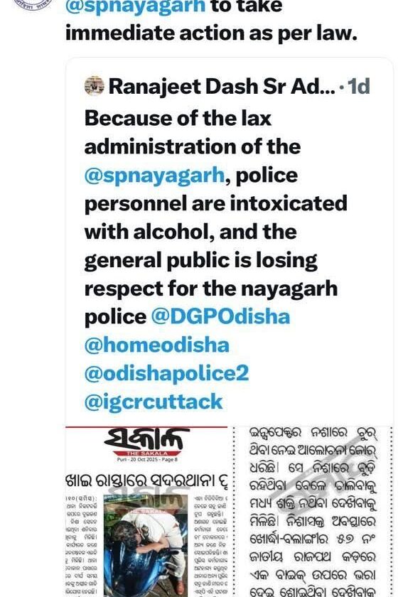 ନୟାଗଡ଼, (ନୟାଗଡ଼ ଦର୍ପଣ): ନୟାଗଡ଼ ଏସପିଙ୍କ ଢିଲା ପ୍ରଶାସନିକ ବ୍ୟବସ୍ଥା ପାଇଁ ଜିଲ୍ଲାରେ ପୋଲିସ କର୍ମଚାରୀ ମଦନିଶାରେ ମତୁଆଲା ହୋଇ ମୋଟର ସାଇକେଲ ଉପରେ ପଡିବା ତ ଆଉ କେହି ରାସ୍ତା ଉପରେ ପଡିରହୁ ଥିବାର ଦୃଶ୍ୟ ବାରମ୍ବାର ଘଟୁଥିବାରୁ ସାଧାରଣରେ ନିନ୍ଦିତ ହେବା ସହିତ ପୋଲିସ ଉପରୁ ସାଧାରଣ ଜନତାଙ୍କ ବିଶ୍ୱାସ ଏବଂ ଭରସାକୁ ନେଇ ପ୍ରଶ୍ନବାଚୀ ସୃଷ୍ଟି ହୋଇଛି ବୋଲି ଜିଲ୍ଲା କଂଗ୍ରେସ ସଭାପତି ତଥା ବରିଷ୍ଠ ଆଇନଜୀବୀ ରଣଜିତ ଦାଶ ଗଣମାଧ୍ୟମକୁ କହିଛନ୍ତି। ମଦ ନିଶାରେ ମତୁଆଲା ପୋଲିସ ଶୀର୍ଷକ ଖବର ପ୍ରମୁଖ ଗଣମାଧ୍ୟମରେ ପ୍ରକାଶିତ ହେବା ପରେ ଜିଲ୍ଲା କଂଗ୍ରେସ ଏହାକୁ ଗମ୍ଭୀରତା ସହ ନେଇଛି ଏବଂ ଏହି ଘଟଣାକ୍ରମ ପାଇଁ ନୟାଗଡ଼ ଏସପିଙ୍କୁ ଦାୟୀ କରି ତୁରନ୍ତ ରାଜ୍ୟ ଗୃହ ବିଭାଗୀୟ ଶାସନ ସଚିବ ଏବଂ ରାଜ୍ୟ ପୋଲିସ ମହାନିର୍ଦ୍ଦେଶକଙ୍କ ହସ୍ତକ୍ଷେପ ଦାବୀ କରି ସମ୍ପୃକ୍ତ ନିୟୁଜ କ୍ଲିପ ସହିତ ଟୁଇଟ କରିଵା ପରେ ମଦ୍ୟପ ପୋଲିସ କର୍ମଚାରୀଙ୍କ ବିରୁଦ୍ଧରେ ଯଥୋଚିତ ଆଇନଗତ କାର୍ଯ୍ୟାନୁଷ୍ଠାନ ଗ୍ରହଣ କରିବା ପାଇଁ ନିର୍ଦ୍ଦେଶ ଦିଆଯାଇ ଥିବା ଟୁଇଟର ଉତ୍ତର ଆସିଛି।