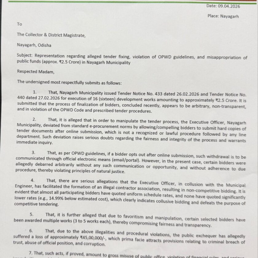 ନୟାଗଡ଼, (ନୟାଗଡ଼ ଦର୍ପଣ): ନୟାଗଡ଼ ମୁନିସିପାଲିଟିରେ ପ୍ରାୟ ଅଢେଇ କୋଟି ଟଙ୍କା ଅଟକଳ ମୂଲ୍ୟର ୧୬ଗୋଟି ଠିକା କାର୍ଯ୍ୟକୁ OPWD ନିୟମାବଳୀକୁ ଉଲଂଘନ କରାଯାଇ କାର୍ଯ୍ୟନିର୍ବାହୀ ଅଧିକାରୀ ତାଙ୍କର କିଛି ନିର୍ଦ୍ଧିଷ୍ଟ ଠିକାଦାରଙ୍କୁ ତିନିଚାରିଟା ଲେଖାଏଁ ପ୍ରକଳ୍ପ କାର୍ଯ୍ୟ ଦେଇଥିବା ଆଜି ଜିଲ୍ଲାପାଳଙ୍କୁ ଜିଲ୍ଲା କଂଗ୍ରେସ ସଭାପତି ରଣଜିତ ଦାଶ ଲିଖିତ ଅଭିଯୋଗ କରିଛନ୍ତି। ଏହି ୧୬ଗୋଟି ଠିକାକାର୍ଯ୍ୟ ପାଇଁ ଅନଲାଇନ ଟେଣ୍ଡର ଆବେଦନ ପାଇଁ ମୁନିସିପାଲିଟି ପକ୍ଷରୁ ବିଜ୍ଞାପନ ପ୍ରକାଶ କରାଯାଇଥିଲା। OPWD ନିୟମ ଆଧାରରେ ଅନଲାଇନ ବିଡିଙ୍ଗ ପରେ ପୁନଶ୍ଚ ଅଫଲାଇନ ଦରଖାସ୍ତ କୌଣସି ଲାଇନ ଯାନ୍ତ୍ରିକ ସଂସ୍ଥାରେ ଆବେଦନ କରାଯାଉ ନଥିବା ବେଳେ ମୁନିସିପାଲିଟି କାର୍ଯ୍ୟନିର୍ବାହୀ ଅଧିକାରୀ ଟେଣ୍ଡର ଫିକ୍ସିଙ୍ଗ ପ୍ରୋତ୍ସାହନ ପାଇଁ ଠିକାଦାର ସଙ୍ଘ ସହିତ ଷଡଯନ୍ତ୍ର କରି ସମସ୍ତ ୧୬ଗୋଟି କାର୍ଯ୍ୟକୁ ନିର୍ଦ୍ଧାରିତ ଅଟକଳ ମୂଲ୍ୟ ଅର୍ଥରାଶିରେ ବିଡିଙ୍ଗ କରାଇଥିଲେ।