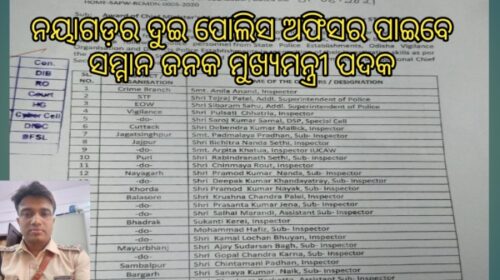 ନୟାଗଡ଼,(୦୧/୦୯):- ତଦନ୍ତ କ୍ଷେତ୍ରରେ ଉତ୍କର୍ଷତା ପାଇଁ ଘୋଷଣା ହେଲା ମୁଖ୍ୟମନ୍ତ୍ରୀ ପଦକ । ୫ ଟି ମୋ ସରକାର ଅଧୀନରେ ସମ୍ମାନଜନକ ମୁଖ୍ୟମନ୍ତ୍ରୀ ପଦକ ପାଇବାକୁ କ୍ରାଇମ୍ବ୍ରାଞ୍ଚ, STF, EOW, ଭିଜିଲାନ୍ସ ଓ ଜିଲ୍ଲା ପୋଲିସରୁ ୬୪ଜଣ ମନୋନୀତ ହୋଇଛନ୍ତି । ଗୃହ ବିଭାଗ ACSଙ୍କ ଅଧୀନରେ ଗଠିତ ହୋଇଥିଲା ରାଜ୍ୟସ୍ତରୀୟ ପୁରସ୍କାର କମିଟି। ଏନେଇ ନୟାଗଡ଼ ଜିଲ୍ଲାରୁ ଉତ୍ତମ ତଦନ୍ତ ପାଇଁ ମୁଖ୍ୟମନ୍ତ୍ରୀଙ୍କ ମେଡାଲ ପାଇବେ ଦୁଇ ପୋଲିସ୍ ସବ ଇନ୍ସପେକ୍ଟର ପ୍ରମୋଦ କୁମାର ନନ୍ଦ ଓ ନୟାଗଡ଼ ସଦର ଥାନା ଅଧିକାରୀ ଦୀପକ କୁମାର ଖଣ୍ଡାୟତରାୟ।