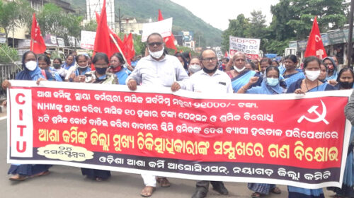 ନୟାଗଡ଼,(୨୪/୦୯): ସିଆଇଟିୟୁ ନେତୃତ୍ୱରେ ଓଡ଼ିଶା ଆଶାକର୍ମୀ ଆସୋସିଏସନ ତରଫରୁ ସିନ୍ଦୁରିଆ ଛକଠାରୁ ଶତାଧିକ ଆଶା କର୍ମୀ ଏକ ଶୋଭାଯାତ୍ରାରେ ବାହାରି ନୟାଗଡ଼ ବଜାର ପରିକ୍ରମା କରି ନୟାଗଡ଼ ଜିଲ୍ଲା ମୁଖ୍ୟ ଚିକିତ୍ସାଳୟ ସମ୍ମୁଖ ତଥା ଖୋର୍ଦ୍ଧା-ବଲାଙ୍ଗୀର ଜାତୀୟ ରାଜପଥରେ ଗଣବିକ୍ଷୋଭ କରିଥିଲେ । ଜାତୀୟ ରାଜପଥ ଅବରୋଧ କରି ପ୍ରାୟ ୨ ଘଣ୍ଟା କାଳ ବିକ୍ଷୋଭ କରାଯାଇଥିଲା । ଜିଲ୍ଲା ସଭାପତି ସୁରେଶ ସ୍ୱାଇଁଙ୍କ ସଭାପତିତ୍ୱରେ ଅନୁଷ୍ଠିତ ଏହି ବିକ୍ଷୋଭ ସମାବେଶରେ କେନ୍ଦ୍ର ମୋଦୀ ସରକାରଙ୍କ ଶ୍ରମିକ ବିରୋଧି ଶ୍ରମ କୋର୍ଡ, ଶ୍ରମିକ ମାରଣାନୀତି ଓ ସ୍ୱାସ୍ଥ୍ୟ ସେବାର ଘରୋଇକରଣ ନୀତିକୁ ବକ୍ତାମାନେ ତୀବ୍ର ସମାଲୋଚନା କରିଥିଲେ । ପ୍ରତିନିଧି ମଣ୍ଡଳୀ ସିଡିଏମଙ୍କୁ ଭେଟି ୧୮ ଦଫା ସମ୍ବଳିତ ଦାବିପତ୍ର ପ୍ରଧାନମନ୍ତ୍ରୀଙ୍କୁ ଦେବା ସହ ଜିଲ୍ଲାରେ ଦେଖା ଦେଇଥିବା ସମସ୍ୟା ଗୁଡ଼ିକ ଉପରେ ଏକ ଦାବୀ ପତ୍ର ମଧ୍ୟ ଦେଇ ତୁରନ୍ତ ସମାଧାନ ପାଇଁ ଦାବୀ କରିଥିଲେ । ବିକ୍ଷୋଭରେ ସିଆଇଟିୟୁର ସଭାପତି ବିଶ୍ୱନାଥ ମହାପାତ୍ର, ଜିଲ୍ଲା ସମ୍ପାଦକ ଶରତ ବେହେରା, ଏସ.ଏ. କରିମ, ଚାପଧାରୀ ରାଉତ, ସଂଯୁକ୍ତା ସେଠୀ, ଆଶାକର୍ମୀଙ୍କ ଜିଲ୍ଲା ସମ୍ପାଦିକା ନଳୀନ ଦାସ, ଜାମିନ ରାଣୀ ବେହେରା, ସସ୍ମିତା ପଟ୍ଟନାୟକ, ସଂଯୁକ୍ତା ପଣ୍ଡା, ରୂପମଞ୍ଜରୀ ସାହୁ, ବାସନ୍ତୀ ସାହୁ, ସରୋଜିନୀ ତ୍ରୀପାଠୀ, ଶଶିକଳା ନାୟକ, ମଙ୍ଗୁଳି ସାହୁ, ଶୁଭଶ୍ରୀ ପଟ୍ଟନାୟକ, ଅହଲ୍ୟା ସେଠୀ, ପାଚାଂଳୀ ସାହୁ, ରେଣୁବାଳା ସାହୁ, ସରୋଜିନୀ ସାହୁ, ପ୍ରତିଭା ବେହେରା, ସ୍ମୃତିରେଖା ସେନାପତି କାକଳି ନାୟକ ପ୍ରମୁଖ ବକ୍ତବ୍ୟ ଦେଇଥିଲେ।